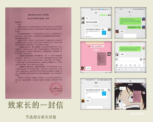 为做好2023届毕业生就业工作,电子工程学院近期积极落实家校联合促就业工作,以《致毕业生家长的一封信》的形式与毕业生家长进行交流沟通,积极推进毕业生高质量就业。