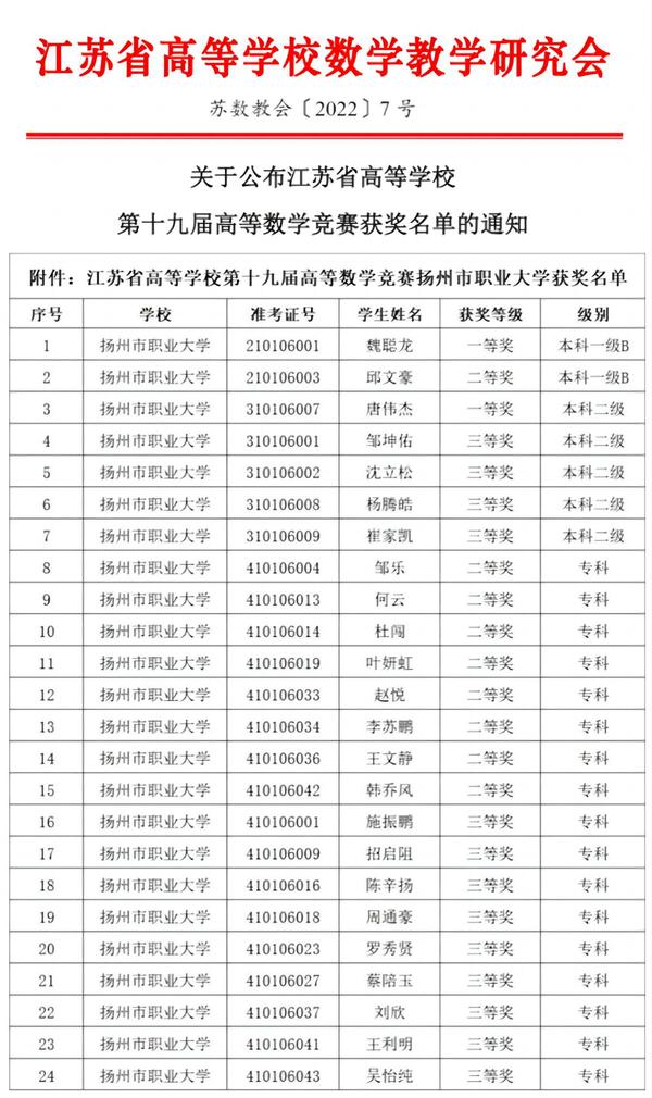 近日,2022年江苏省高等学校第十九届高等数学竞赛结果揭晓,冰球官网学子在本次竞赛中再创佳绩。今年冰球官网共48名同学参赛,有24人在各个参赛组别内获奖。本科一级B组1位同学获一等奖,1位同学获二等奖;本科二级1位同学获一等奖,4位同学获三等奖;专科级别8位同学获二等奖,9位同学获三等奖。