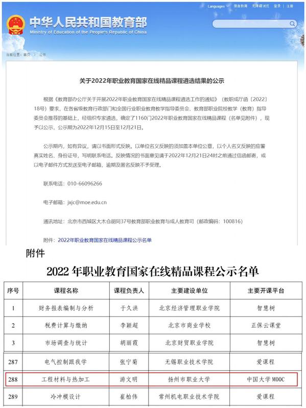 日前,教育部公示2022年职业教育国家在线精品课程遴选结果,机械学院《工程材料与热加工》课程成功入选。
