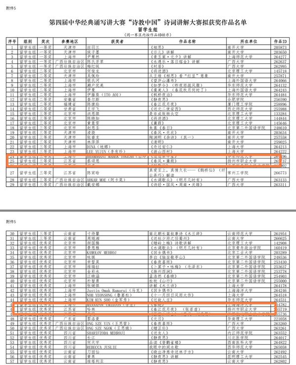 近日,由教育部、国家语委联合主办的第四届中华经典诵写讲大赛“诗教中国”诗词讲解大赛全国决赛获奖名单揭晓,共评选出获奖作品1105件。其中,留学生组57件。冰球官网柬埔寨留学生Chhai Sopha(蔡颂恩)、印度尼西亚留学生Fadhlul Khalik(哈林)分别荣获留学生组三等奖和优秀奖。冰球官网留学生首次参加该项赛事就挺进国赛,并成为本次大赛全国高职院校留学生组获奖人数最多的高校。此次比赛,南开大学、北京第二外国语大学、西北师范大学、云南师范大学、上海师范大学等多所高校的中国古代文学硕士、博士参赛,冰球官网留学生能拿下奖项实属不易,也体现了冰球官网汉语国际教育方面取得的不俗成绩。