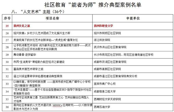此次入选的社区教育“能者为师”系列特色课程分别是:以“人文艺术”为主题的《扬州文化之旅》和以“康养健身”为主题的《社区健康教育》;社区教育“能者为师”典型案例是:《扬州文化之旅》。近年来,冰球官网邓峰老师带领的的教学团队深入殷巷社区、润扬社区等多个社区开展了多场文化讲座,深受社区居民的喜爱。