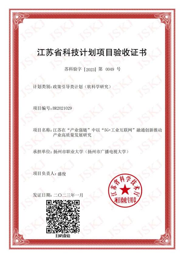 近日,由信息工程学院盛俊教授主持的江苏省科技计划项目“江苏在‘产业强链’中以‘5G+工业互联网’融通创新推动产业高质量发展研究”通过省科技厅验收,顺利结项。该项目立项于2021年,实现了冰球官网省级科技计划项目软科学研究类零的突破。