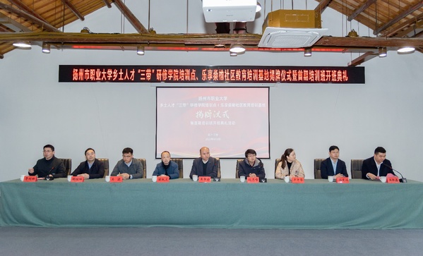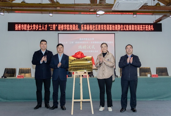 揭牌仪式上,吴书安、倪志峰、濮跃文、吴逊共同为扬州市乡土人才“三带”研修学院培训点揭牌,卢子华、徐宽兴、胡程辉、王银鑫共同为“乐享桑榆社区教育培训基地”揭牌。