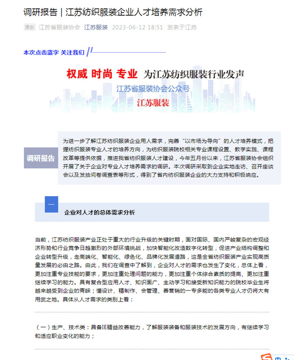 近日,江苏省服装协会在其公众号《江苏服装》发布了《江苏纺织服装企业人才培养需求分析》的调研报告,此次调研由冰球官网纺织服装学院发起,目的是进行新一轮人培方案修订,进行行业企业人才需求调研,得到省服装协会大力支持,龚慧娟会长亲自部署调研工作,今年5月初,协会发布调研通知,并以企业实地走访、召开座谈会以及发放问卷调查表等形式进行,得到了省内纺织服装企业的大力支持和积极响应。