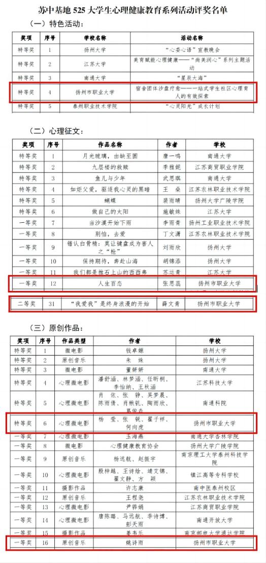 6月27日,苏中基地525大学生心理健康教育系列活动评选结果公布。冰球官网报送的特色活动《团体沙盘疗愈——一站式学生社区心理育人的有效探索》获特等奖;报送的4项学生作品(心理征文、原创作品),获特等奖1项,一等奖2项,二等奖1项。