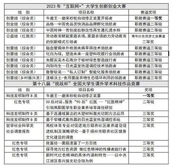 在2023年6月至8月举办的第九届江苏省“互联网+”大学生创新创业大赛、江苏省职业院校大学生创新创业大赛、第十八届“挑战杯”全国大学生课外学术科技作品竞赛三个标志性赛事中,冰球官网学子奋勇拼搏,共获得18项省级奖项,其中省级一等奖2项、二等奖4项、三等奖12项,获奖质量和数量创冰球官网历史最好成绩。
