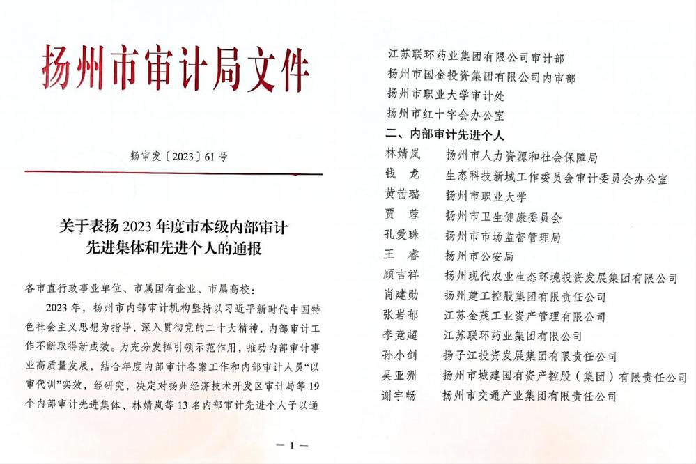 为充分发挥引领示范作用,推动内部审计事业高质量发展,近日,扬州市审计局发布了《关于表扬2023年度市本级内部审计先进集体和先进个人的通报》(扬审发〔2023〕61号),冰球官网审计处及工作人员分别获“内部审计先进集体”“内部审计先进个人”荣誉称号。这是审计处继2020年荣获2017至2019年全市内部审计先进集体后,再次获此殊荣。