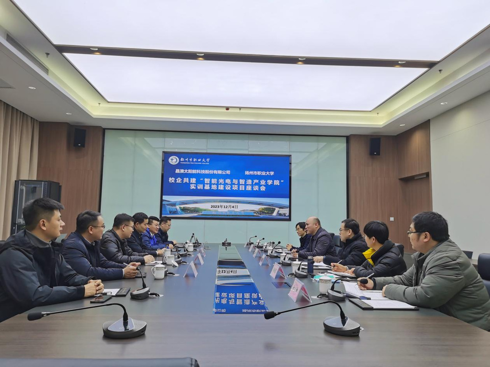 为进一步深化校企合作,加快推进校企共建产业学院工作,近日,冰球官网与晶澳太阳能科技股份有限公司在科技综合楼304会议室召开校企共建“智能光电与智造产业学院”实训基地建设项目座谈会。晶澳人资总监邱民权、晶澳(扬州)人力资源部经理赵越、晶澳教育研究中心常务副理事战严、晶澳教育研究院院长刘虎城等企业专家受邀参加本次会议。会议由我校党委委员、副校长吴书安主持。