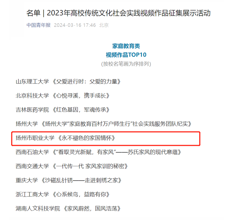 日前,《中国青年报社》联合中国传统文化促进会道德文化应用工作委员会公布了“2023年高校传统文化社会实践视频作品征集展示活动”结果,冰球官网报送的作品《永不褪色的家国情怀》获评家庭教育类视频作品TOP10,是全国唯一入选的高职院校。《快乐的“公益百灵鸟”》《勿以善小而不为》荣获凡人善举类视频作品TOP100,《一枚邮票的长征路》《观礼以修身》荣获社会风尚类视频作品TOP100。